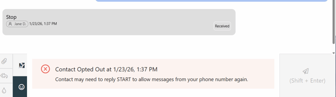 We send the TextBetter user a notification making them aware that their message was not delivered due to recipients opt out status. This ensures transparency for your team while maintaining compliance with wireless carrier requirements.