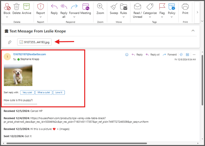 When someone sends you a picture message, the image arrives via email. The picture is both attached to the email and embedded in the message body.